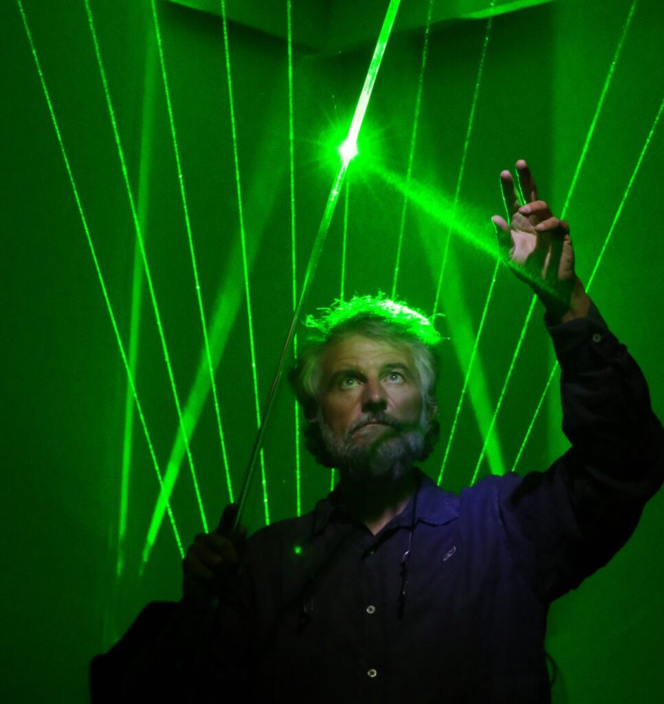 A master of multisensory immersion, Pietro fuses music, physics, and digital technology to ‘play’ light as a tangible, oscillating force. His installations resonate through architectural and natural spaces, blurring boundaries between sound and vision.